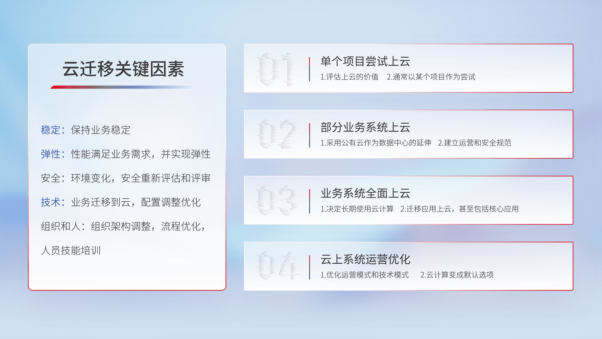 结合实际业务,,,从规划设计、、、云平台选型、、、云原生改造、、、、数据迁移、、、、集成交付,,,迁移全过程为客户识别最佳上云路径,,,做好风险识别管理,,,,设计网络架构、、身份权限、、、安全审计合规、、、、操作审计、、、、日志审计、、、、监控告警策略、、、、多站点容灾设计等,,对云上基础设施进行整体规划,,提升IT治理水平,,,以满足弹性、、高可用、、高性能的需求。。。
